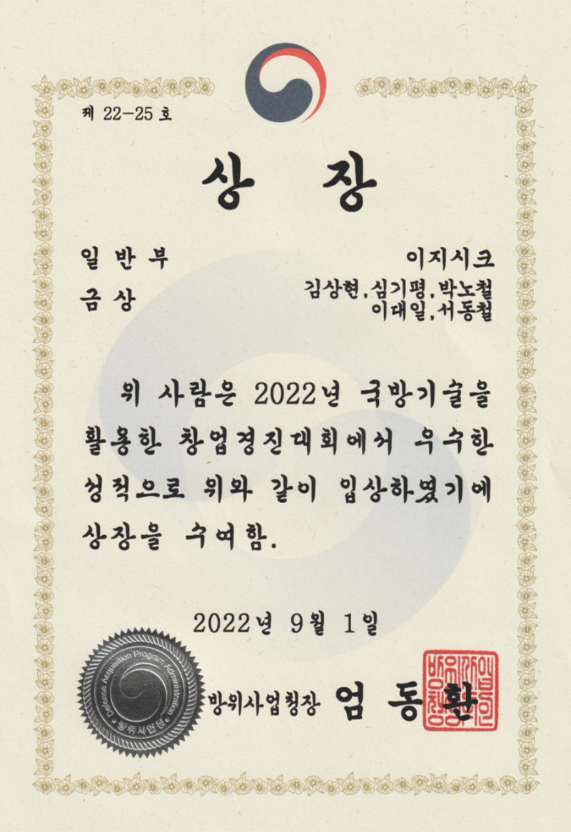 • 방위사업청 주관 창업 경진대회 금상(1위) 수상
